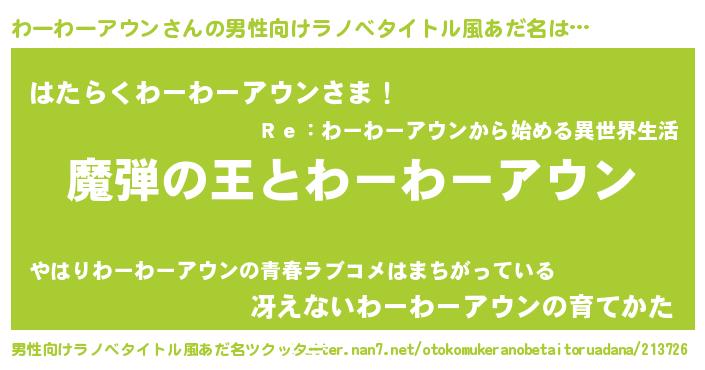 | 女子向けラノベタイトル風あだ名 | 『わーわーアウンが死なない童話 林檎のわーわーアウンの診療簿』 |