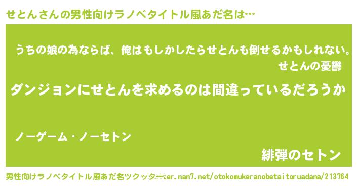 | 胡散臭い通販商品みたいなあだ名 | 『信頼と実績のサプリメント…その名も「せとん」』 |