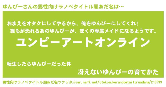 | 女子向けラノベタイトル風あだ名 | 『誰かこのゆんぴーを説明してください! ~契約から始まるウェディング~』 |