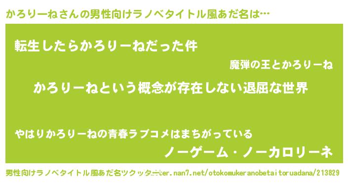 | 女子向けラノベタイトル風あだ名 | 『かろりーねの契約王妃』 |