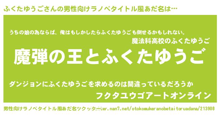 | 女子向けラノベタイトル風あだ名 | 『ふくたゆうごが死なない童話 林檎のふくたゆうごの診療簿』 |