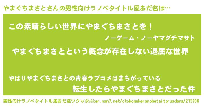 | 女子向けラノベタイトル風あだ名 | 『異世界で失敗しない100のやまぐちまさと』 |