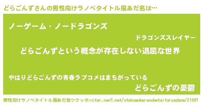 | 女子向けラノベタイトル風あだ名 | 『異世界で失敗しない100のどらごんず』 |