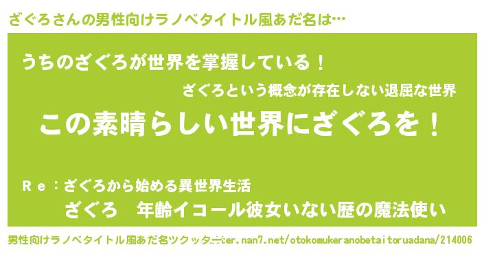 | 胡散臭い通販商品みたいなあだ名 | 『あなたにだけ特別に提供する限定10本のレアな日本酒…その名も「ざぐろ」』 |