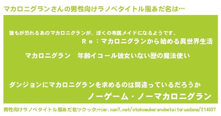 | 女子向けラノベタイトル風あだ名 | 『マカロニグランの玉の輿計画!』 |