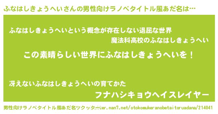 | 胡散臭い通販商品みたいなあだ名 | 『あなたにだけ特別に提供する100年もののヴィンテージワイン…その名も「ふなはしきょうへい」』 |