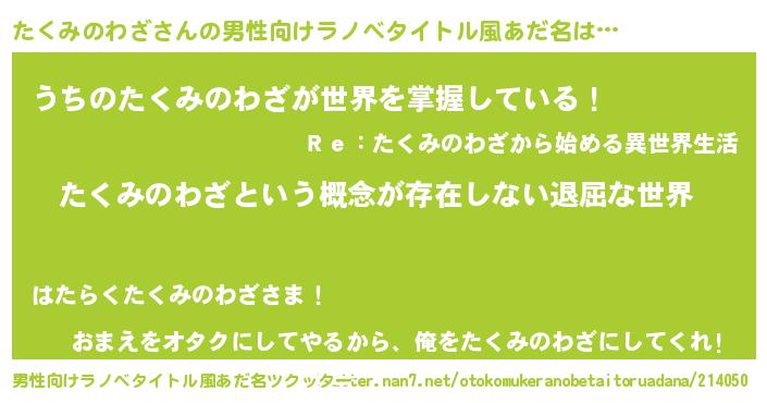 | 胡散臭い通販商品みたいなあだ名 | 『絶対に幸福をもたらす健康食品…その名も「たくみのわざ」』 |