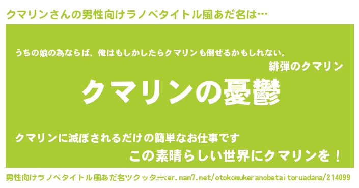 | 女子向けラノベタイトル風あだ名 | 『(仮)クマリンのやんごとなき事情』 |