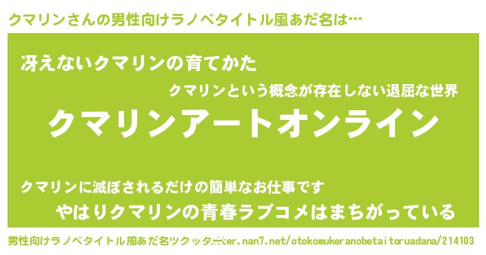 | 女子向けラノベタイトル風あだ名 | 『クマリン姫と円卓の騎士』 |
