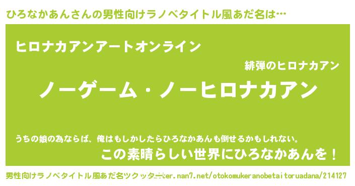 | 女子向けラノベタイトル風あだ名 | 『死神ひろなかあんの再婚』 |