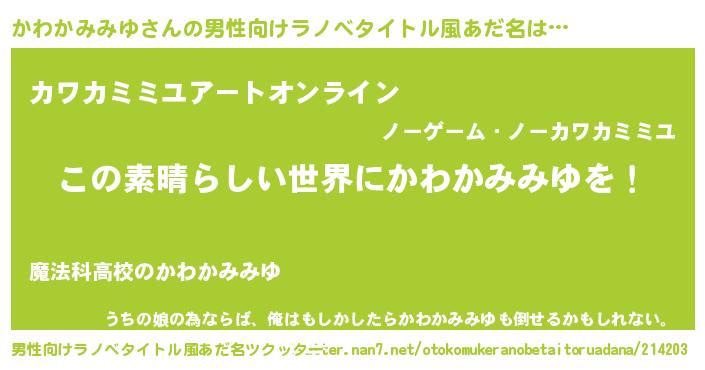 | 女子向けラノベタイトル風あだ名 | 『悪役かわかみみゆに転生したようですが、知った事ではありません』 |
