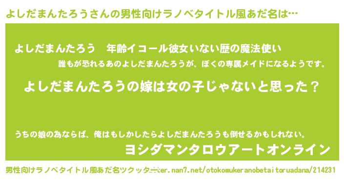 | 女子向けラノベタイトル風あだ名 | 『よしだまんたろうの卵を拾いまして』 |
