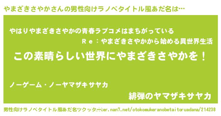 | 女子向けラノベタイトル風あだ名 | 『乙女ゲームの破滅フラグしかない悪役やまざきさやかに転生してしまった…』 |