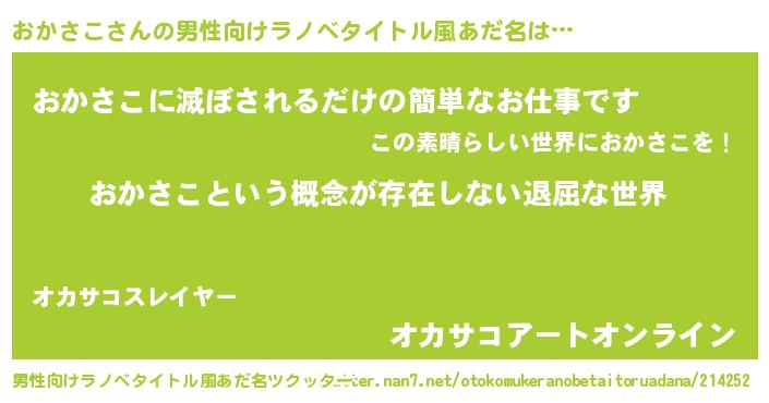 | 女子向けラノベタイトル風あだ名 | 『異世界で失敗しない100のおかさこ』 |