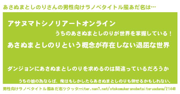 | 女子向けラノベタイトル風あだ名 | 『異世界で失敗しない100のあさぬまとしのり』 |