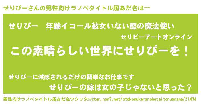 | 胡散臭い通販商品みたいなあだ名 | 『あなたにだけ特別に提供する限定10本のレアな日本酒…その名も「せりぴー」』 |