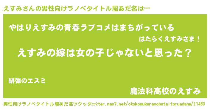 | 女子向けラノベタイトル風あだ名 | 『えすみの卵を拾いまして』 |