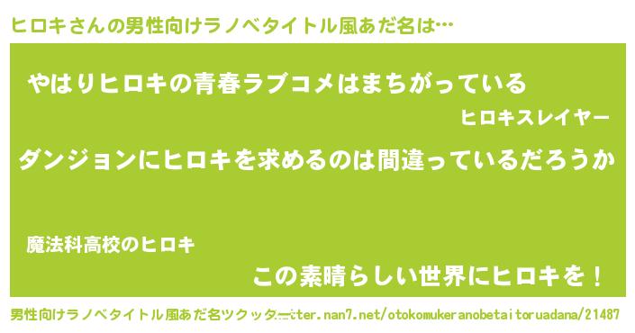 | 女子向けラノベタイトル風あだ名 | 『ヒロキの卵を拾いまして』 |