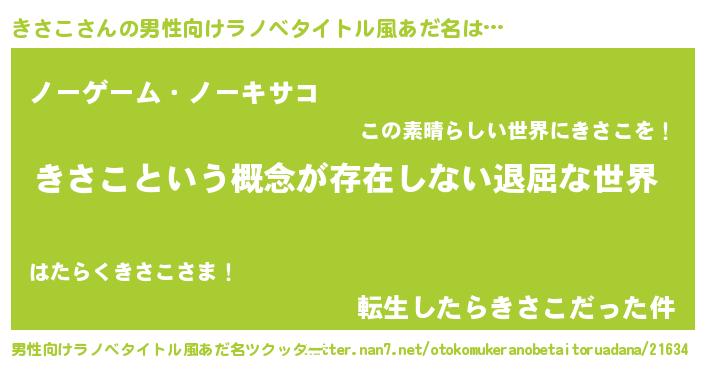 | 女子向けラノベタイトル風あだ名 | 『異世界で失敗しない100のきさこ』 |