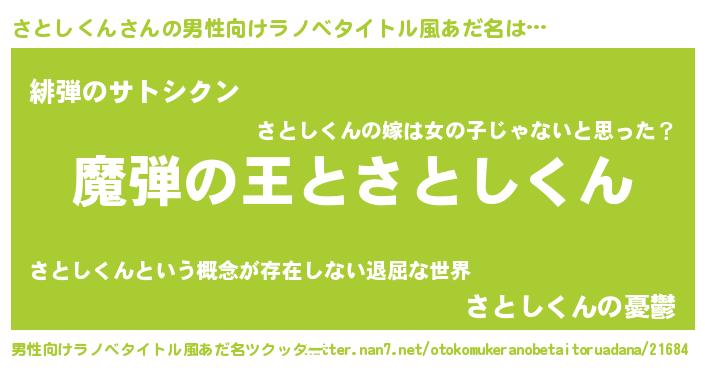 | 女子向けラノベタイトル風あだ名 | 『さとしくんが死なない童話 林檎のさとしくんの診療簿』 |