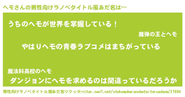 | 女子向けラノベタイトル風あだ名 | 『ヘモの雑貨屋さん』 |