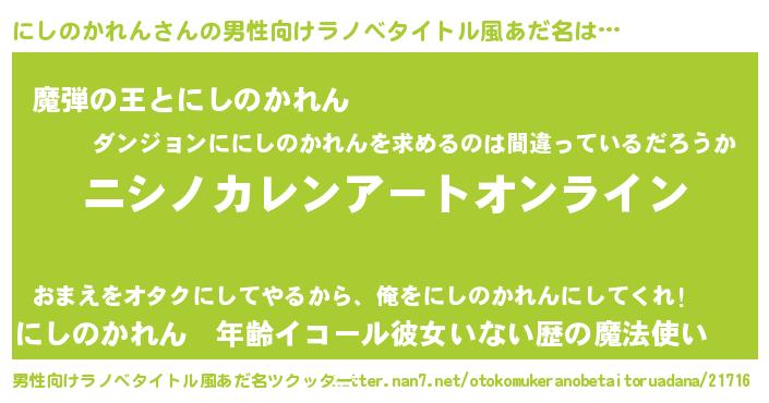 | 胡散臭い通販商品みたいなあだ名 | 『モテモテ間違いなし霊験あらたかなお札…その名も「にしのかれん」』 |