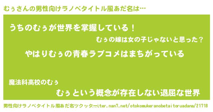 | 女子向けラノベタイトル風あだ名 | 『むぅの雑貨屋さん』『むぅ様がみてる』 |
