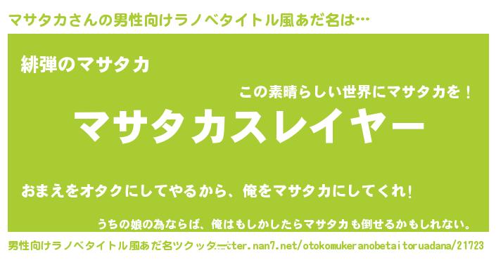 | 女子向けラノベタイトル風あだ名 | 『婚約破棄系悪役マサタカに転生したので、保身に走りました。』 |