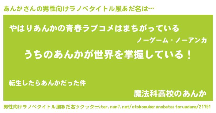 | 女子向けラノベタイトル風あだ名 | 『男装あんかの憂鬱な任務』 |