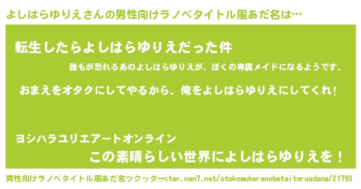 | 女子向けラノベタイトル風あだ名 | 『よしはらゆりえ夫妻のなれそめ』 |