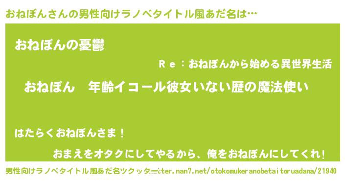 | 女子向けラノベタイトル風あだ名 | 『おねぼんの玉の輿計画!』 |
