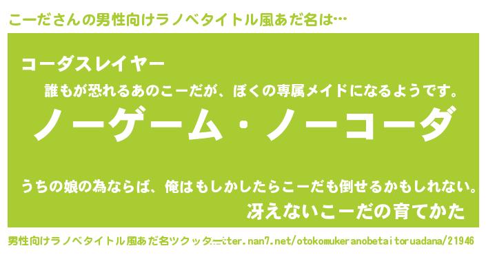 | 女子向けラノベタイトル風あだ名 | 『死神こーだの再婚』『こーだの婚約者』 |