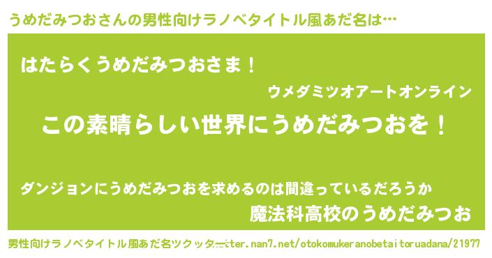 | 女子向けラノベタイトル風あだ名 | 『乙女ゲームの破滅フラグしかない悪役うめだみつおに転生してしまった…』 |
