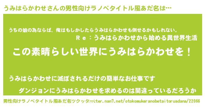 | 胡散臭い通販商品みたいなあだ名 | 『あなたにだけ特別に提供する限定10本のレアな日本酒…その名も「うみはらかわせ」』 |