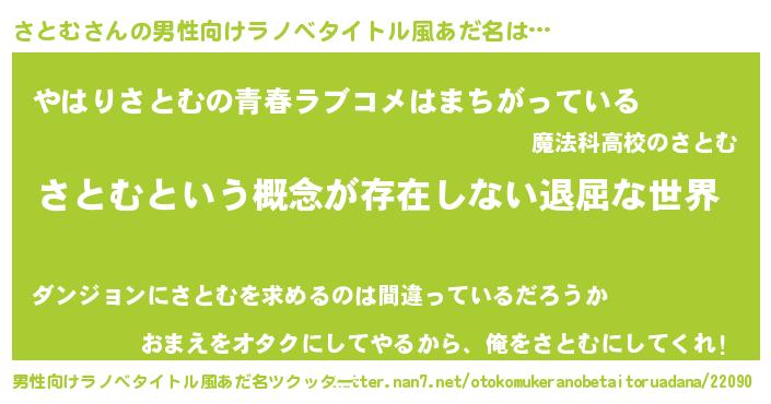 | 女子向けラノベタイトル風あだ名 | 『異世界で失敗しない100のさとむ』 |