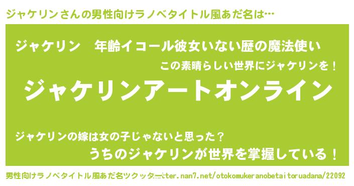 | 女子向けラノベタイトル風あだ名 | 『誰かこのジャケリンを説明してください! ~契約から始まるウェディング~』 |