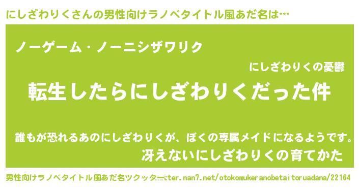 | 女子向けラノベタイトル風あだ名 | 『にしざわりくの玉の輿計画!』 |