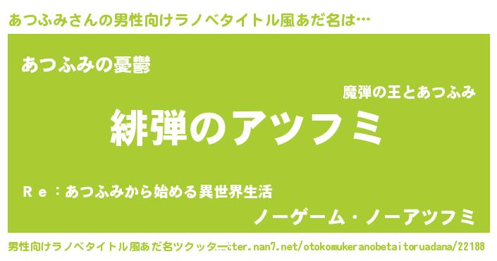 | 女子向けラノベタイトル風あだ名 | 『シンデレラあつふみ家の靴箱館』 |