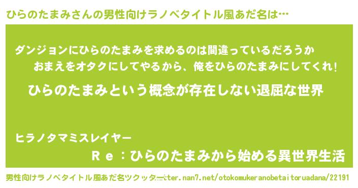 | 女子向けラノベタイトル風あだ名 | 『異世界で失敗しない100のひらのたまみ』 |
