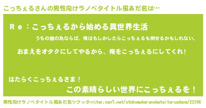 | 女子向けラノベタイトル風あだ名 | 『こっちぇる夫妻のなれそめ』 |