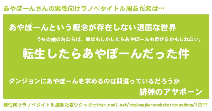| 女子向けラノベタイトル風あだ名 | 『あやぽーんの玉の輿計画!』 |