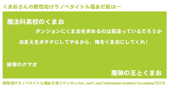 | 女子向けラノベタイトル風あだ名 | 『くまお夫妻のなれそめ』 |
