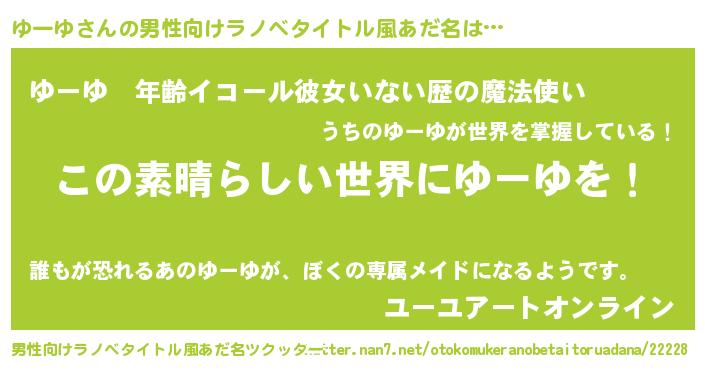 | 女子向けラノベタイトル風あだ名 | 『乙女ゲームの破滅フラグしかない悪役ゆーゆに転生してしまった…』 |