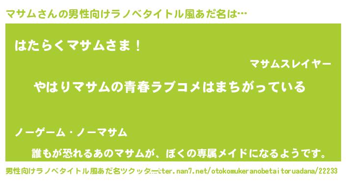 | 女子向けラノベタイトル風あだ名 | 『マサム伯爵の花嫁』『マサムの契約王妃』 |