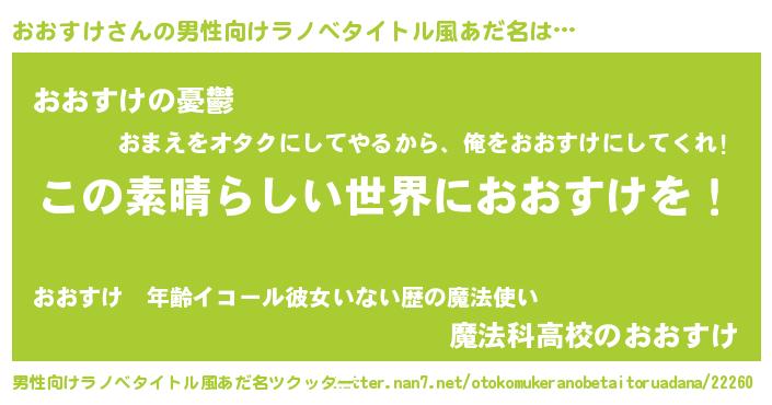 | 女子向けラノベタイトル風あだ名 | 『乙女ゲームの破滅フラグしかない悪役おおすけに転生してしまった…』 |