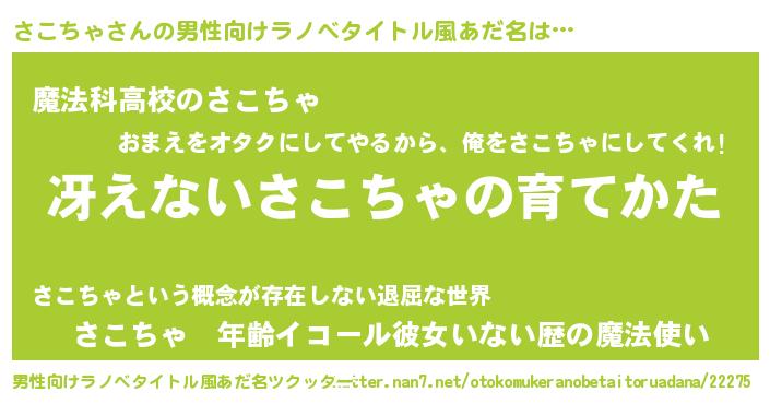 | 意味不明あだ名 | 『自称さこちゃ』『エリンギ科さこちゃ属』 |