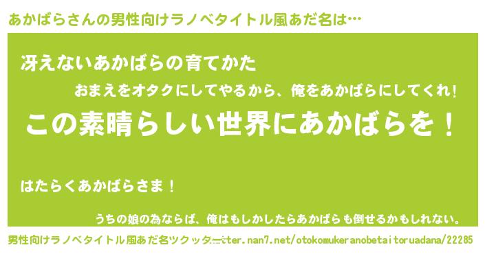 | 女子向けラノベタイトル風あだ名 | 『悪役あかばらに転生したようですが、知った事ではありません』 |