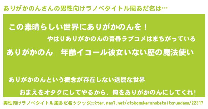 | 女子向けラノベタイトル風あだ名 | 『ありがかのんの玉の輿計画!』 |