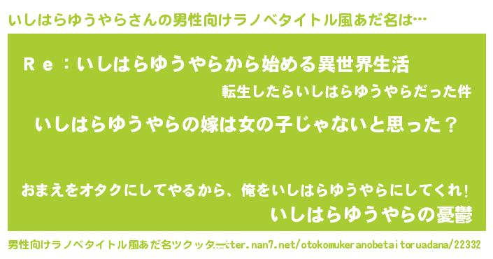 | 女子向けラノベタイトル風あだ名 | 『いしはらゆうやら様がみてる』 |