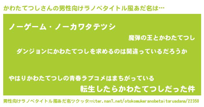 | 肩書あだ名 | 『かわたてつし塾長』『かわたてつし少尉』 |
